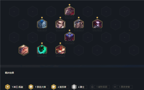 这个阵容的强势期从6人口开始,这个时候只需要组成4骑士2复苏,给吸血鬼一个龙牙或者石像鬼板甲就可以做到刀枪不入的效果,前期的大部分阵容对于这种高免伤防守阵容也毫无办法。