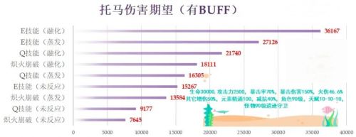 若想提高伤害,这里特别说一下,可能堆双暴不如堆火伤。伤害区=(1+x),暴击伤害区=(1+y),需要y>x,堆双暴才划算。也就是因为这样,有的情况下,把生命头换成暴击率头,不如生命杯换成火伤杯。另外,托马作为高贵火属性,可以打反应,在托马的常用队伍中,托马偶尔会打出反应,若托马E技能打出反应,堆点精通,伤害也不错的。总结就是,想提高托马伤害,可以堆火伤,也可以堆双暴,也可以叠精通打点反应,换句话说就是在特定情况下,可以魔女乐团。