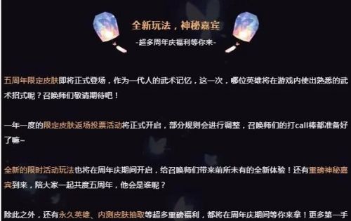 除了体验服更新内容以外,王者荣耀五周年的系列活动已经陆续开启,第一个开始的活动为星河拾梦活动,参与活动领对应称号【荣耀五年玩家】。后续更多精彩也将上线,今年五周年限定皮肤主题为一代人的武术记忆;限定皮肤返场投票活动将于近期开启,投票规则有改动,具体改动详情等待官宣;全新限时模式周年庆开启,内测皮肤抽奖活动即将上线。
