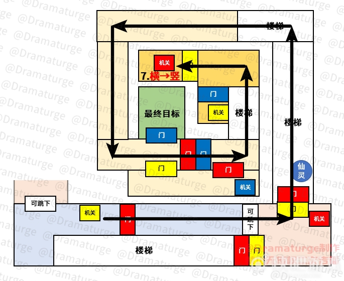 *按下图黑色箭头走,仅触发图片中标注序号和横竖的机关。