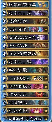 牧师方:北郡、哀黄、低费解牌、灭、拉兹、DK,起手有都可以留。谨慎使用aoe,打盗贼永远要学会面对第一个5费蓝龙的压场,硬币千万别乱交,往往你和胜利就只差一个硬币的距离。维纶、莱拉,别卡手该上就上,炎术师、奥金尼、甚至血法,谨慎使用。