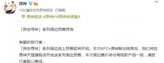 今日《原神》再次就此次的联动发文,预告了「异世寻味」系列周边的预售:“「异世寻味」系列周边线上预售即将开启。本次KFC×原神联动结束后,我们将在原神天猫旗舰店开放该系列周边预售,本次周边售价将与常规款产品一致,请旅行者耐心等待。”