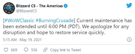 当服务器到早上5点还没开服时,暴雪的售后账户在Twitter上发布消息称,他们不得不将服务器维护工作时间延长到早上9点。两小时后,该账户再次发帖称,维护时间又要延长了4小时,至上午11点。