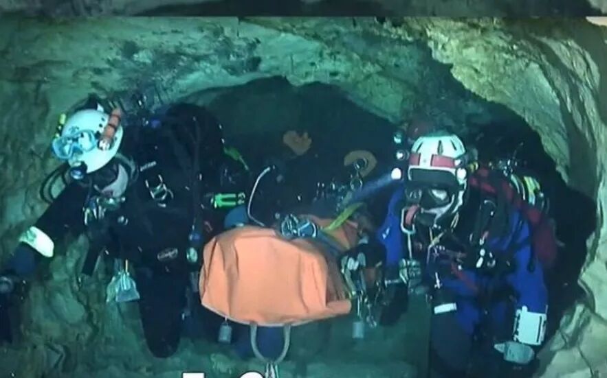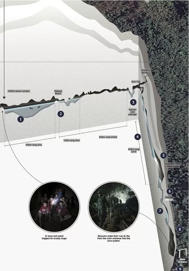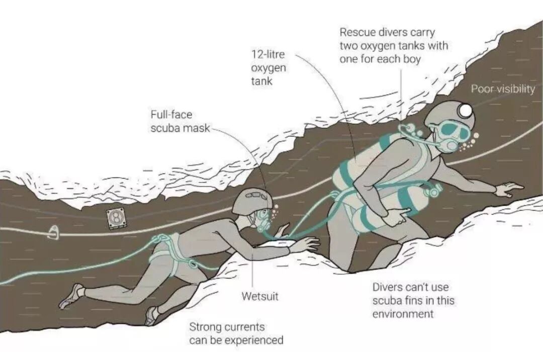 这是男孩们的所在地与救援队伍位置的剖面示意图,如果先不考虑混浊、冰冷与完全黑暗的水下环境;