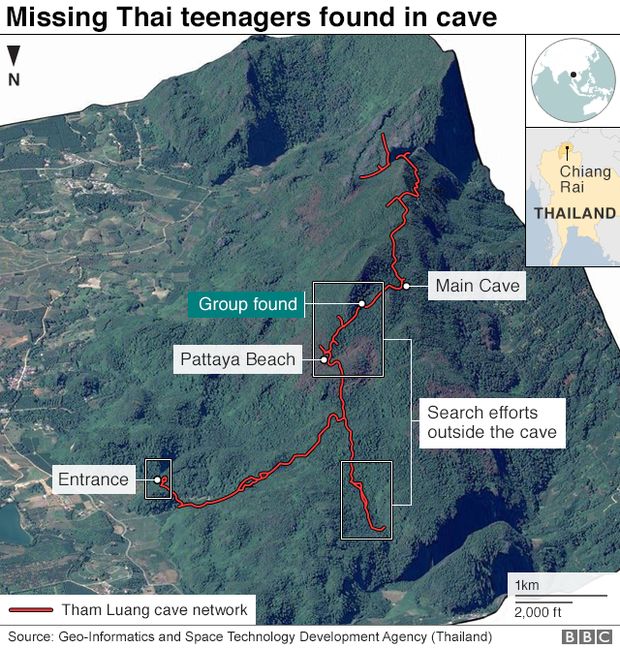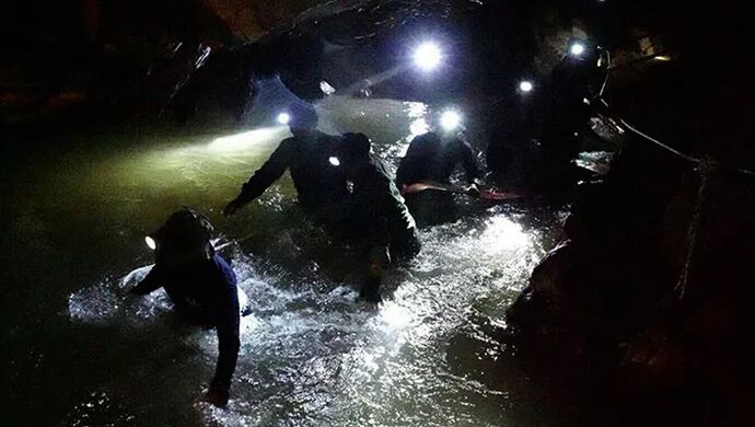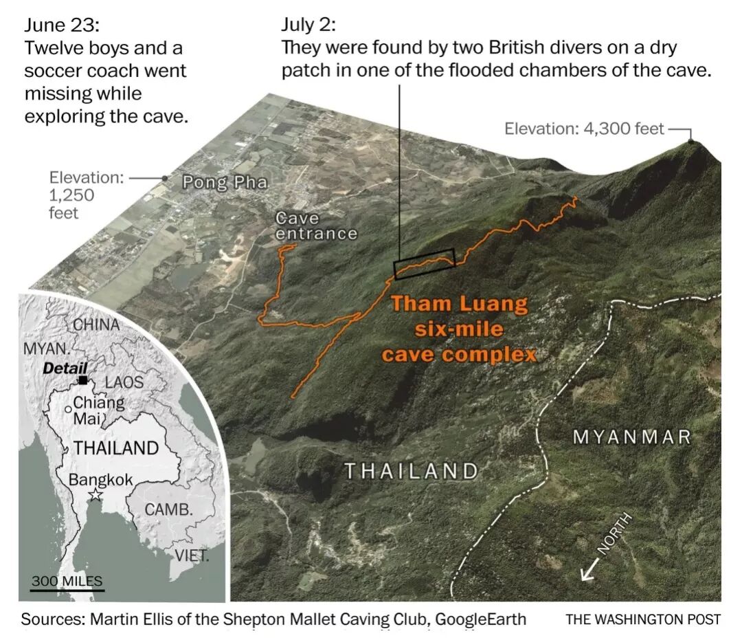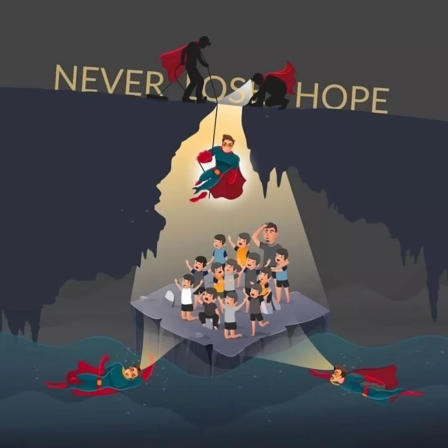 之前的事,已在各类新闻媒体的滚动播出中,各个关键词早被大家所熟悉——6月23日、阳光明媚的下午、睡美人山洞(Tham Luang Nang Non)、探险、突降暴雨、地下水暴涨、被困其中;