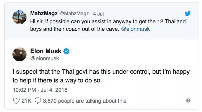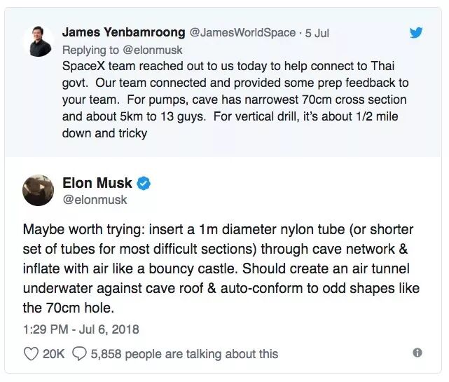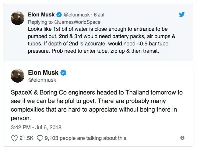 比如经常被人们喻为钢铁侠的Elon Musk在危机时刻也像托尼·史塔克般地挺身而出,不仅与泰国政府建立联系,与泰国一家工程公司创始人就救援策略进行反复沟通,讨论包括抽出积水与充入空气等各种救援方法,并给根据其SpaceX公司与Boring公司的工程经验给出各种有效建议:
