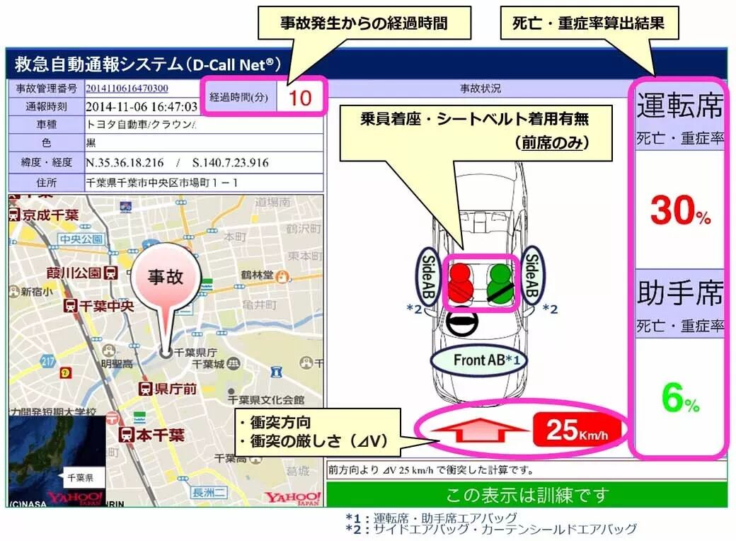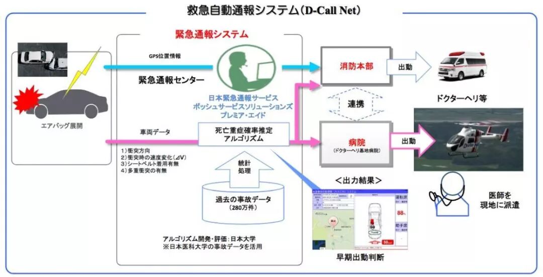 如图所示,D-Call Net使用车辆Konekutiddo连接技术,根据日本约280万起事故的数据分析结果,通过自动分析事故车辆的各项数据,估算致命和重伤的概率。第一时间向消防部门和医院自动发送报告,方便空中救援直升机和地面救护车迅速做出调度决定,用最快速的反应来有效提高交通事故的存活率。