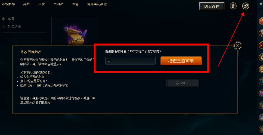 在英雄联盟端游游戏中,改名字的方法是,玩家先前往英雄联盟客户端中的商城找到海克斯科技及其他,接着在海克斯及其他的界面中找到加成道具,接下来在加成道具的界面中,在购买点券的右边有一个账号设置点击并进入,最后点击一下改名卡进入修改召唤师名的界面,把玩家想要更改的名字输入后点击一下右边的检查是否可用,再点一下入手改名卡就可以了。